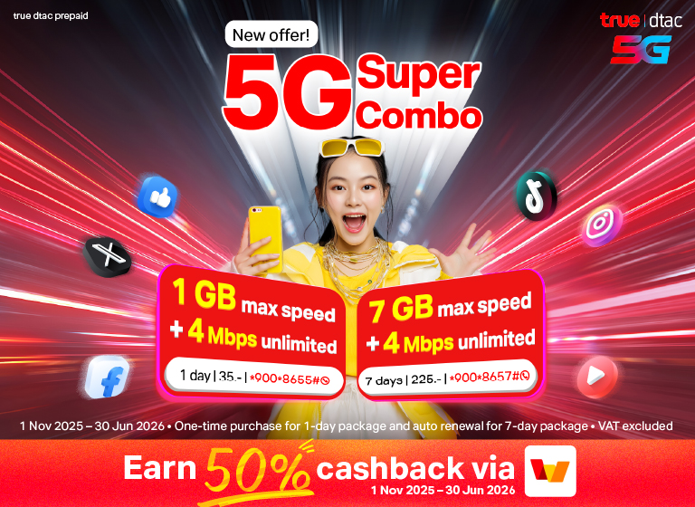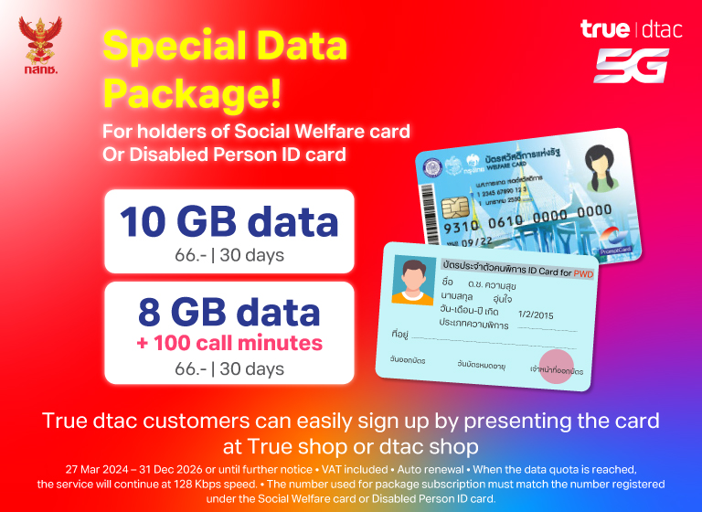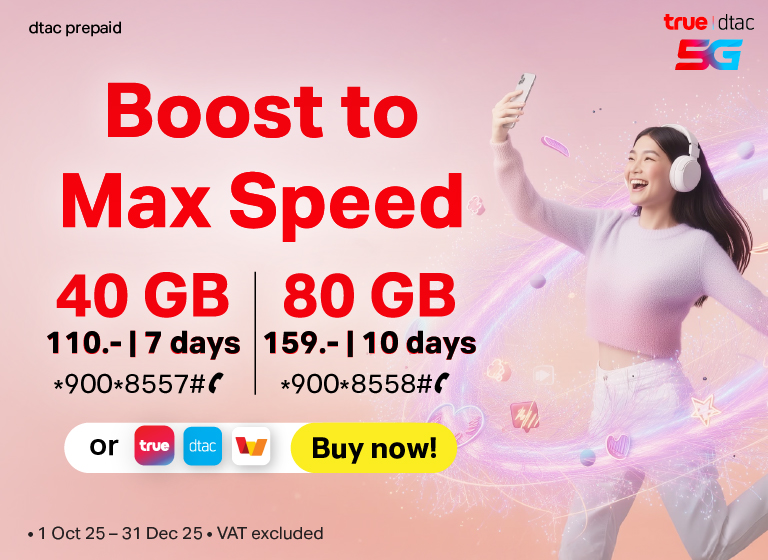 All types of dtac Prepaid SIMs that suit our customers; Unlimited Internet, No Speed Drop, Voice Calls, No Internet Leaks, SIMs for use in Myanmar and Cambodia. Plus Tourist SIM that provides internet throughout your trip in Thailand.