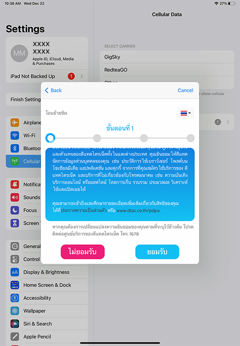 iPad เครื่องเก่าจะมีข้อความแจ้ง เพื่อทำการยืนยัน “ถ่ายโอนแผนบริการเซลลูลาร์”