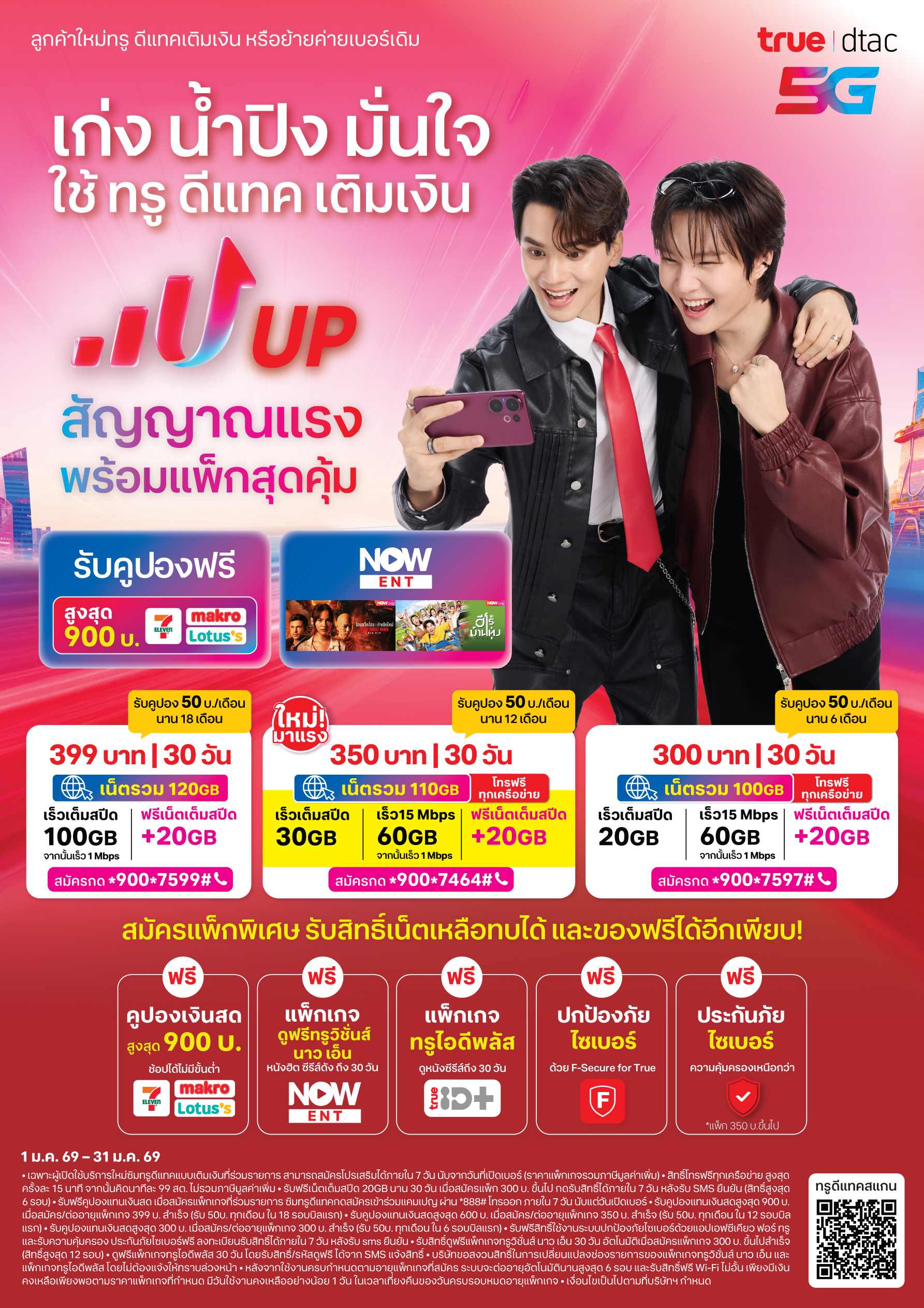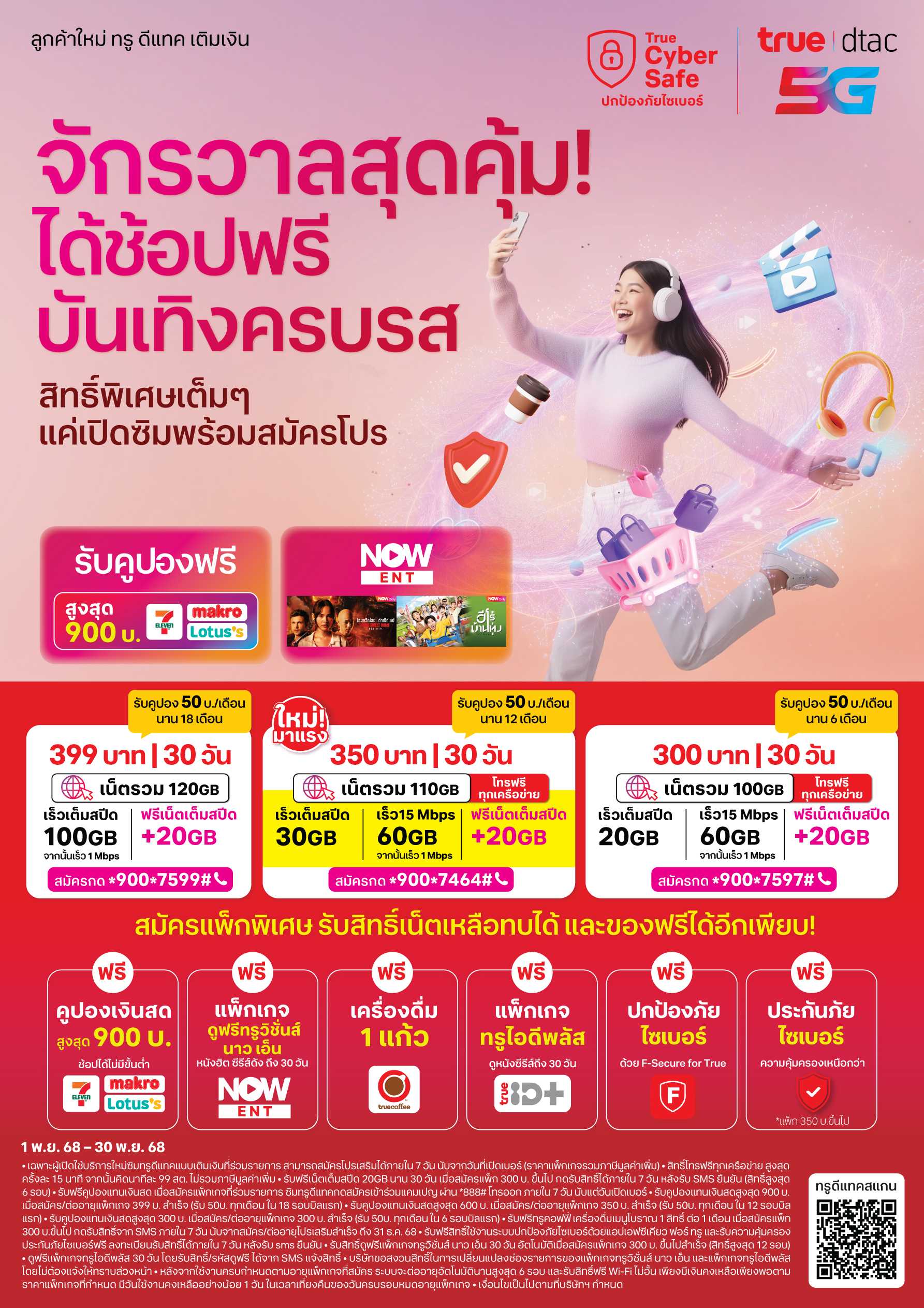 - รับคูปองแทนเงินสดสูงสุด 600 บ. เมื่อสมัคร/ต่ออายุแพ็กเกจ 350 บ. สำเร็จ (รับ 50บ. ทุกเดือน ใน 12 รอบบิลแรก)