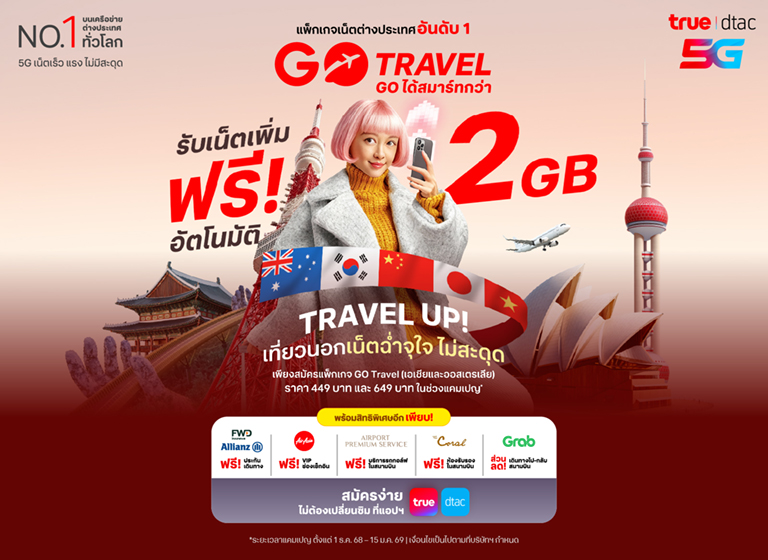 - รายการส่งเสริมการขาย “แพ็กเกจเสริมเน็ตในต่างประเทศ GO Travel” สำหรับผู้ใช้บริการโทรศัพท์เคลื่อนที่แบบจดทะเบียนรายเดือนและเติมเงินประเภทบุคคลธรรมดาที่เป็นลูกค้าปัจจุบันและต้องมีสถานะปกติ ตั้งแต่วันที่ 16 กันยายน 2568 เป็นต้นไป หรือจนกว่าจะมีการเปลี่ยนแปลงจากบริษัทฯ