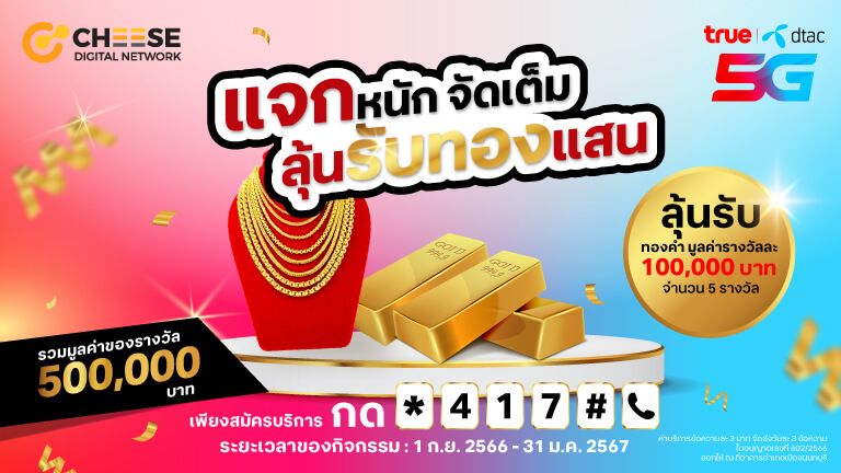 โทร *439# ก็มีสิทธิ์ลุ้นทองคำมูลค่า 100,000 บาท จำนวน 5 รางวัล และ บัตรโลตัส 500 บาท จำนวน 40 รางวัล เพียงสมัครบริการ ดวงเศรษฐี